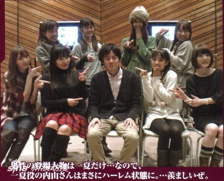 这让人想起此前《IS》热播时,主人公声优、当时21岁的内山昂辉也是每日被比自己年龄要大的姐姐们包围着,并在照片中流露出了很无奈的表情。不过可喜可贺的是等到《IS》放送结束后,或许是因为卸下了包袱,也或许是已经习惯了一男多女的工作环境,内山终于在合影中展现出了后宫王者气质。